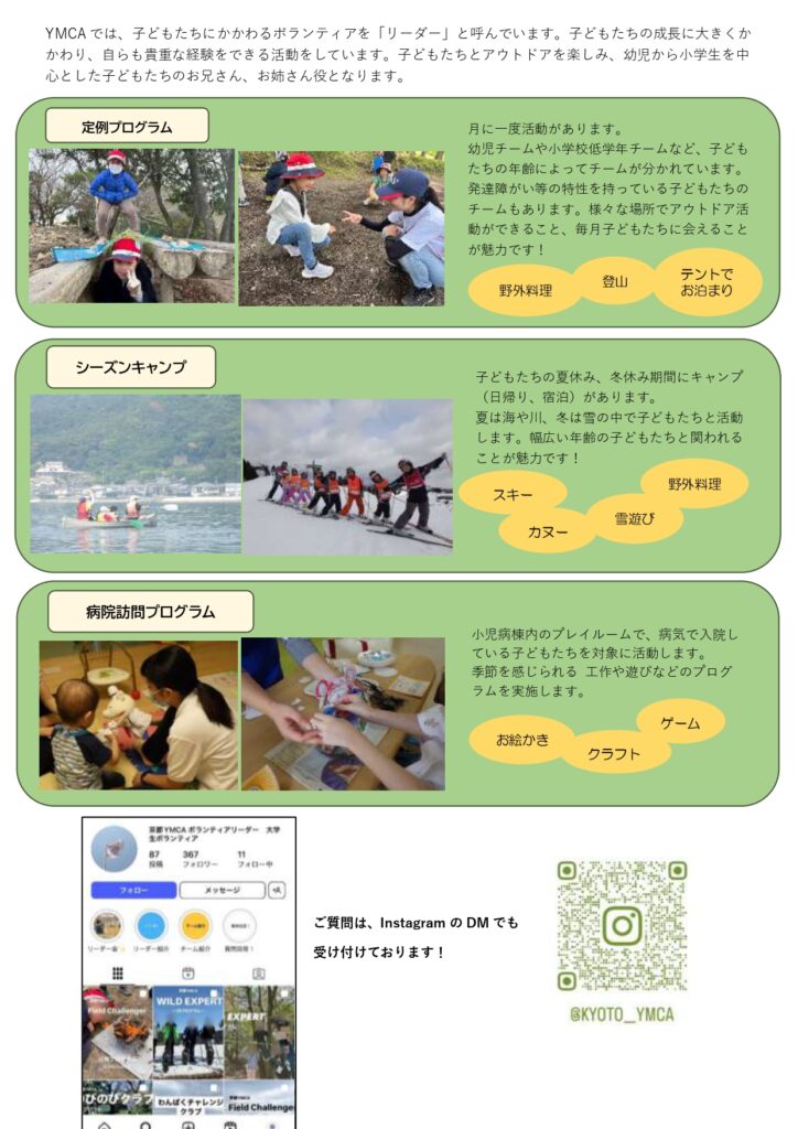 京都YMCAの自然体験学習では、ボランティアリーダーを募集しています。