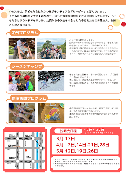 条件:子どもが好きな方、屋外での活動に関心のある方、学校卒業まで継続して参加できる方