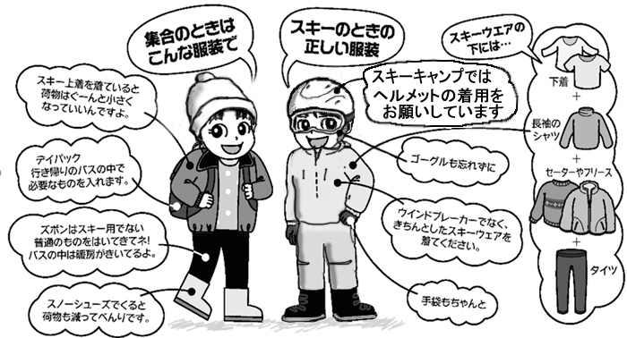 *スキー時の服装は、下着+薄手の服(長袖Tシャツなど)+厚手の服(フリース、セーターなど)+スキーウエアが基本です。当日の気温や、スキーウエアの厚さによって服や枚数を調節してご用意ください。